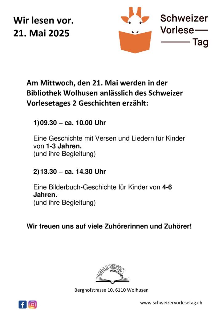 Schweizer Vorlesetag Am Mittwoch, den 21. Mai werden in der Bibliothek Wolhusen anlässlich des Schweizer Vorlesetages 2 Geschichten erzählt: 1) 09.30 – ca. 10.00 Uhr Eine Geschichte mit Versen und Liedern für Kinder von 1-3 Jahren. (und ihre Begleitung) 2) 13.30 – ca. 14.30 Uhr Eine Bilderbuch-Geschichte für Kinder von 4-6 Jahren. (und ihre Begleitung) […]